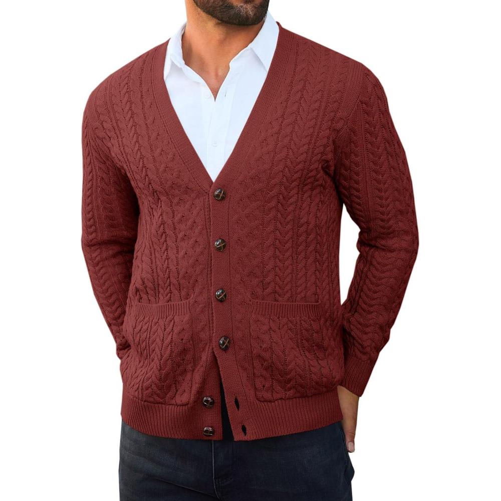 Runcati Mens Cardigan Sweater Casual Cable Knitted V Neck Button Down Winter Sweaters(Wine Red)