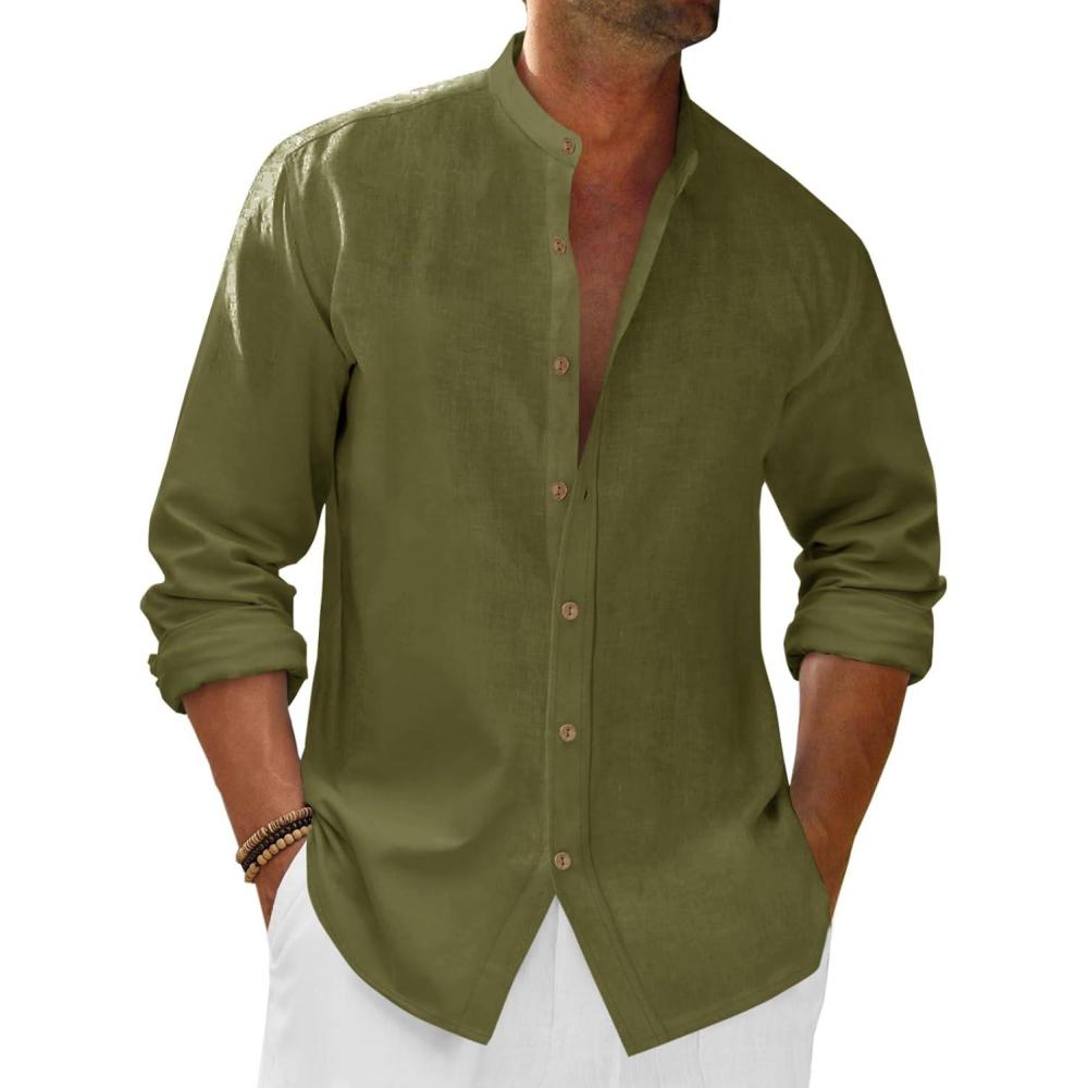 Runcati Mens Casual Linen Shirts 3/4 Sleeve Button Down Banded Collar Summer Beach Shirt(Army Green)
