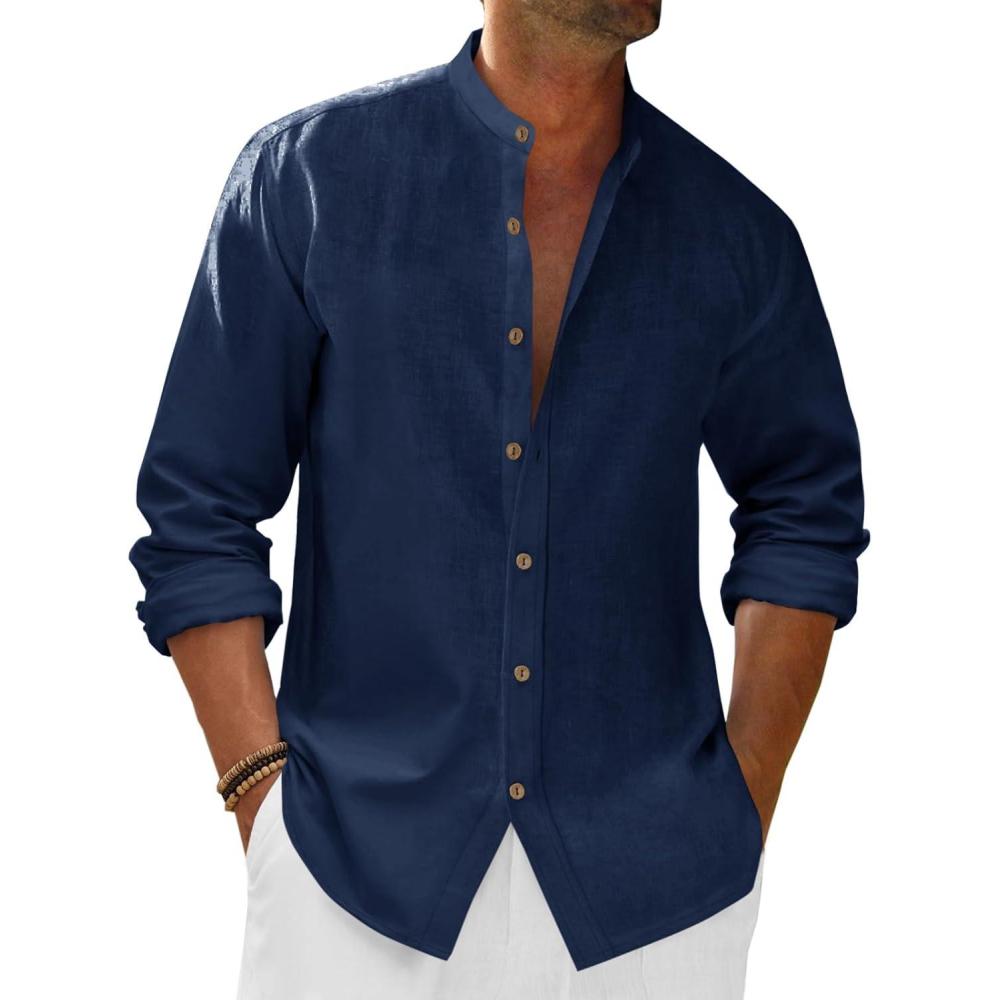 Runcati Mens Casual Linen Shirts 3/4 Sleeve Button Down Banded Collar Summer Beach Shirt(Navy Blue)