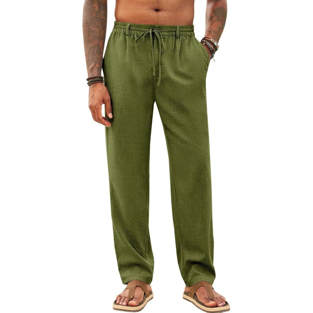 Runcati Mens Casual Pants Linen Elastic Waist Drawstring Lightweight Pants Loose Fit Summer Beach Yoga Trouser(Army Green)