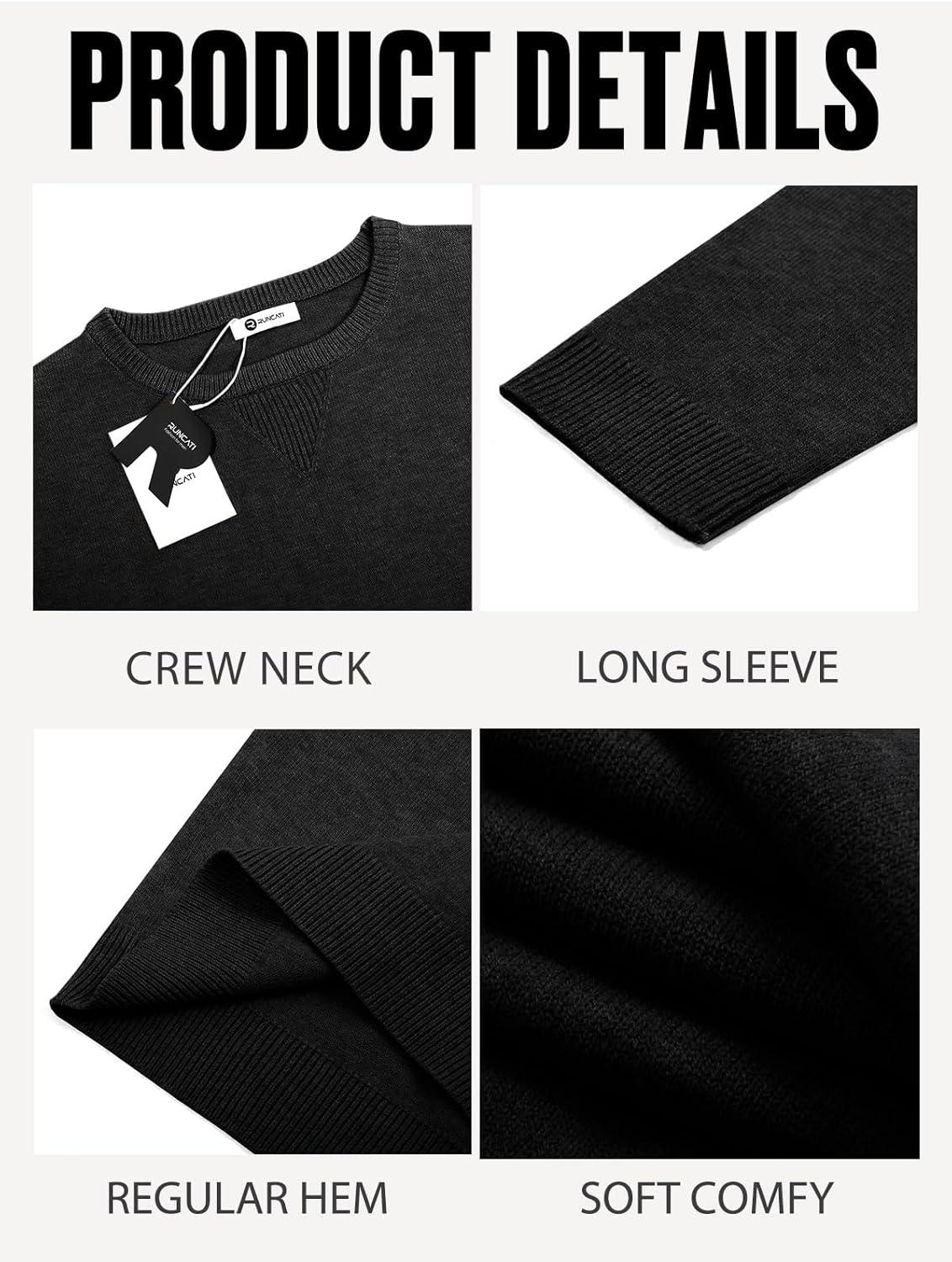 Runcati Mens Crewneck Sweaters Casual Knit Lightweight Dress Sweater Long Sleeve Slim Fit Fall Winter Pullover(Black)