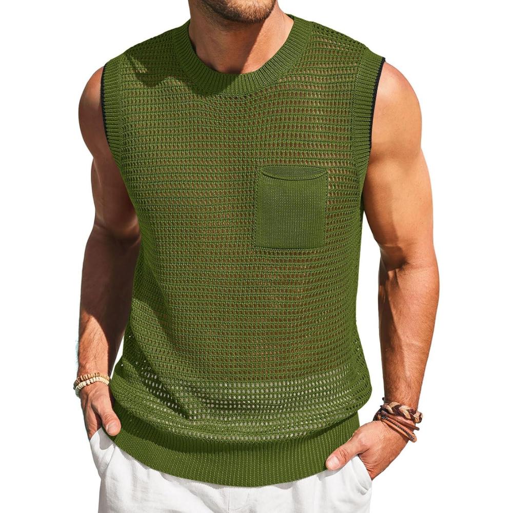 Runcati Mens Crochet Tank Tops See Through Knitted Sleeveless T-Shirts Muscle Summer Beach Hippie Shirts with Pocket(Army Green)