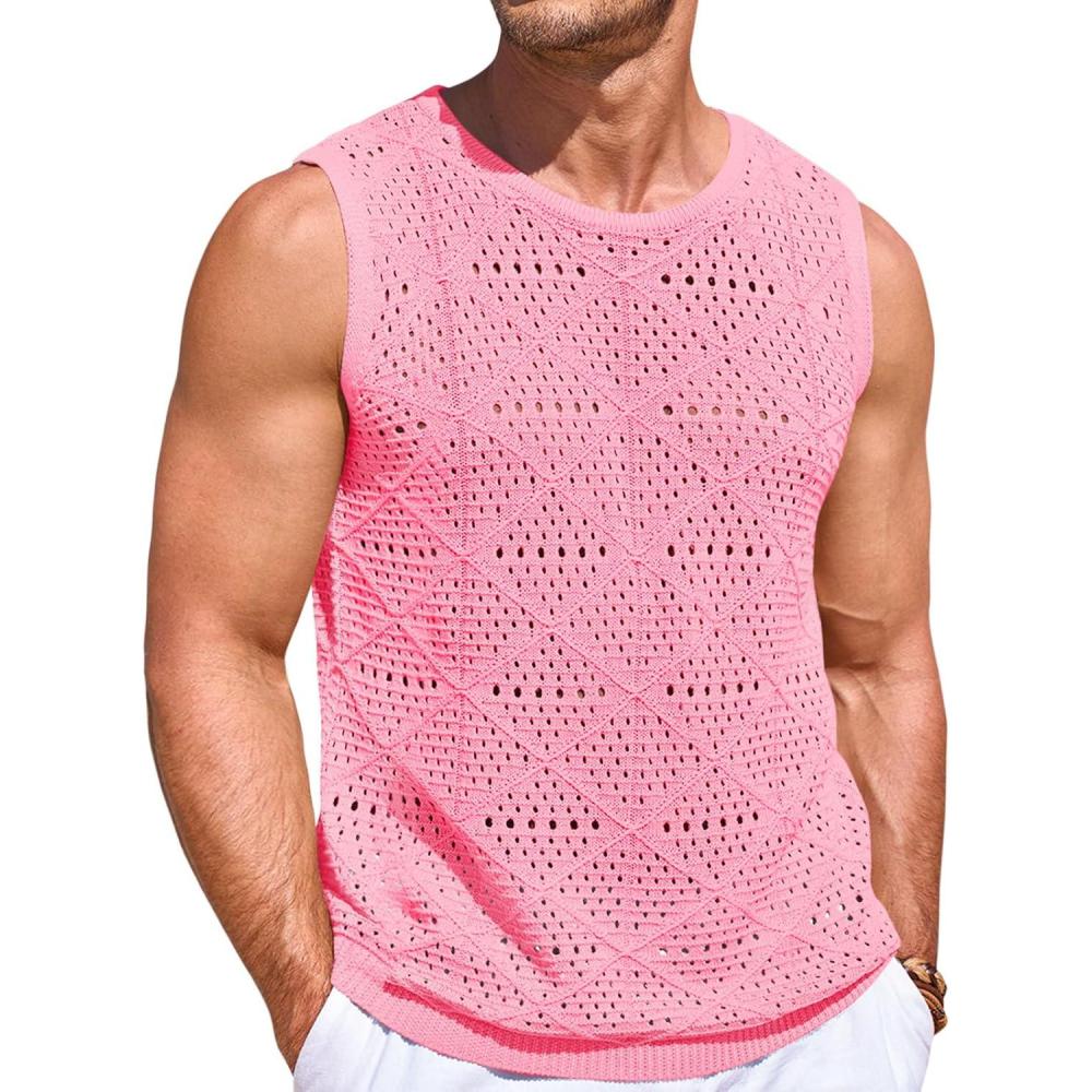 Runcati Mens Knitted Tank Tops Casual Sleeveless Hollow Out Crochet T-Shirts Muscle Summer Beach Hippie Shirts(Pink)