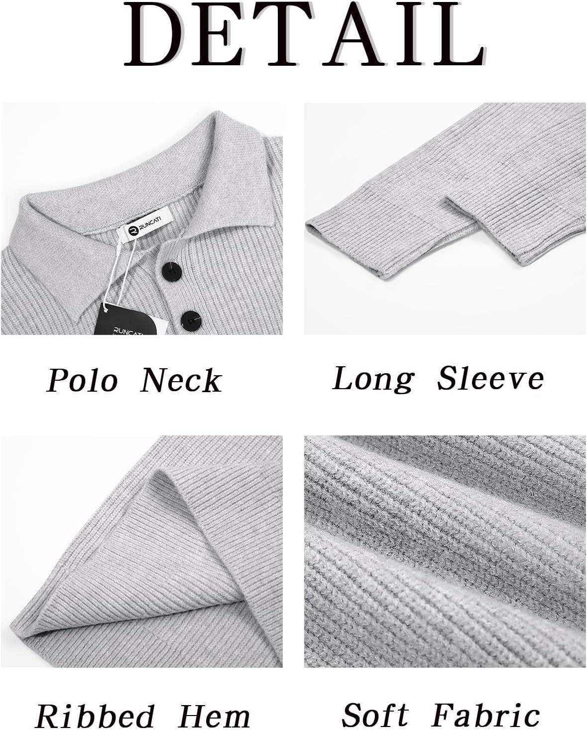 Runcati Mens Long Sleeve Polo Sweater Knit Polos V Neck Casual Dress Button Collared Pullover Sweaters(Light Grey)
