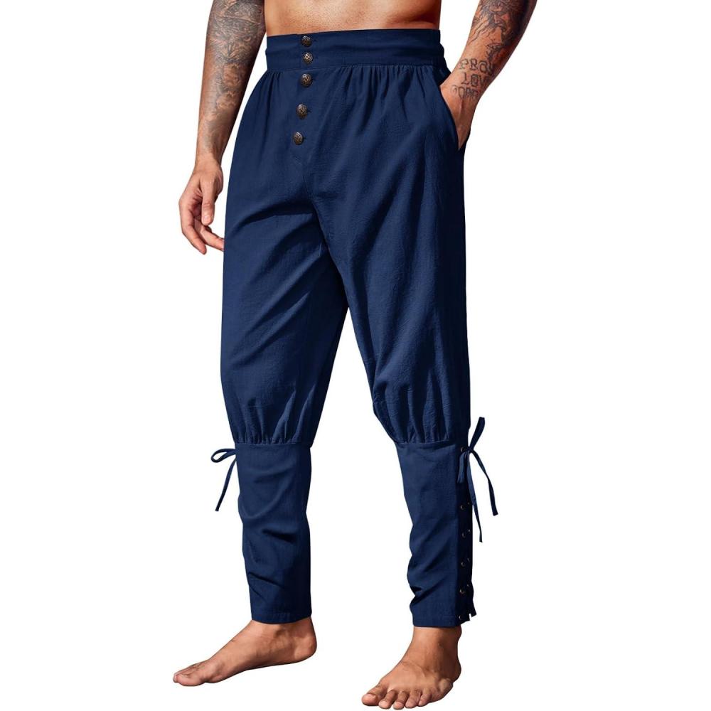 Runcati Mens Medieval Pirate Pants Renaissance Ankle Banded Viking Ren Faire Pants Lace Up Halloween Costume Trousers(Navy Blue)