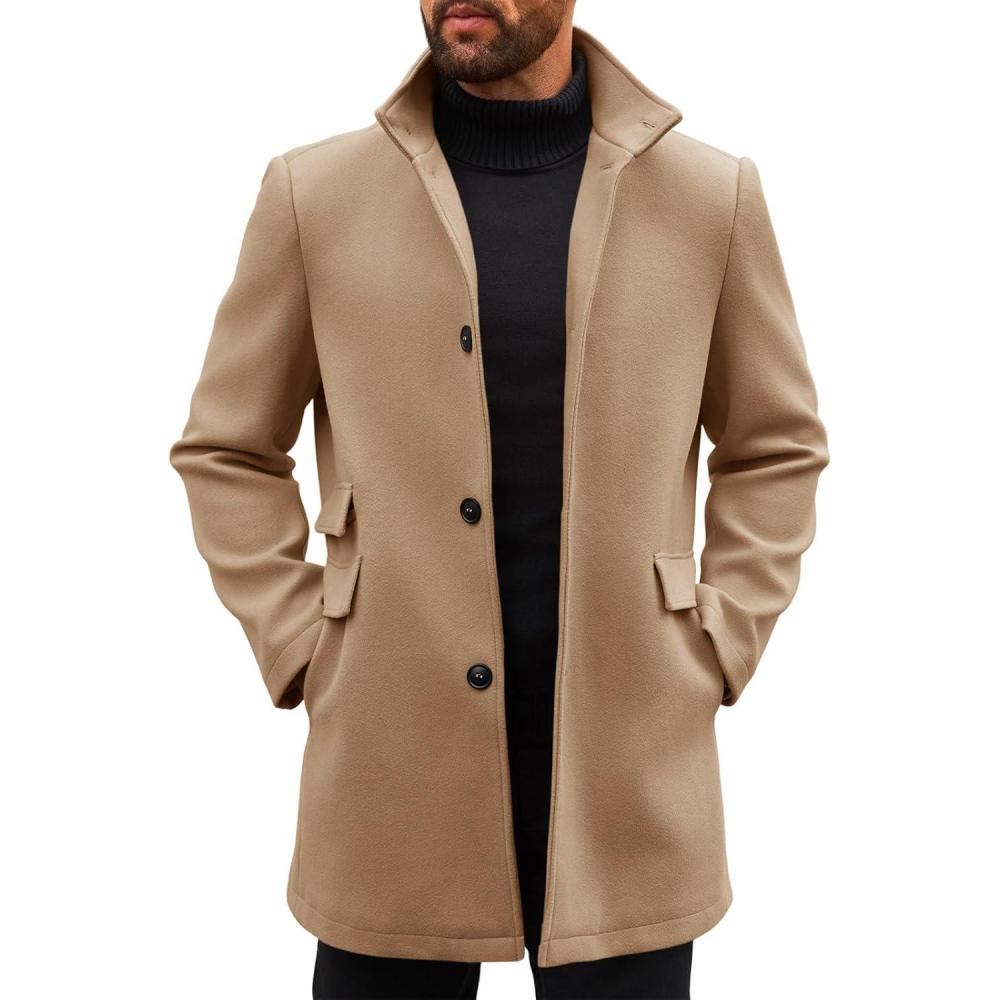 Runcati Mens Pea Coats Single Breasted Stand Collar Casual Slim Fit Trench Coat Mid Long Winter Overcoat with Pockets(Khaki)