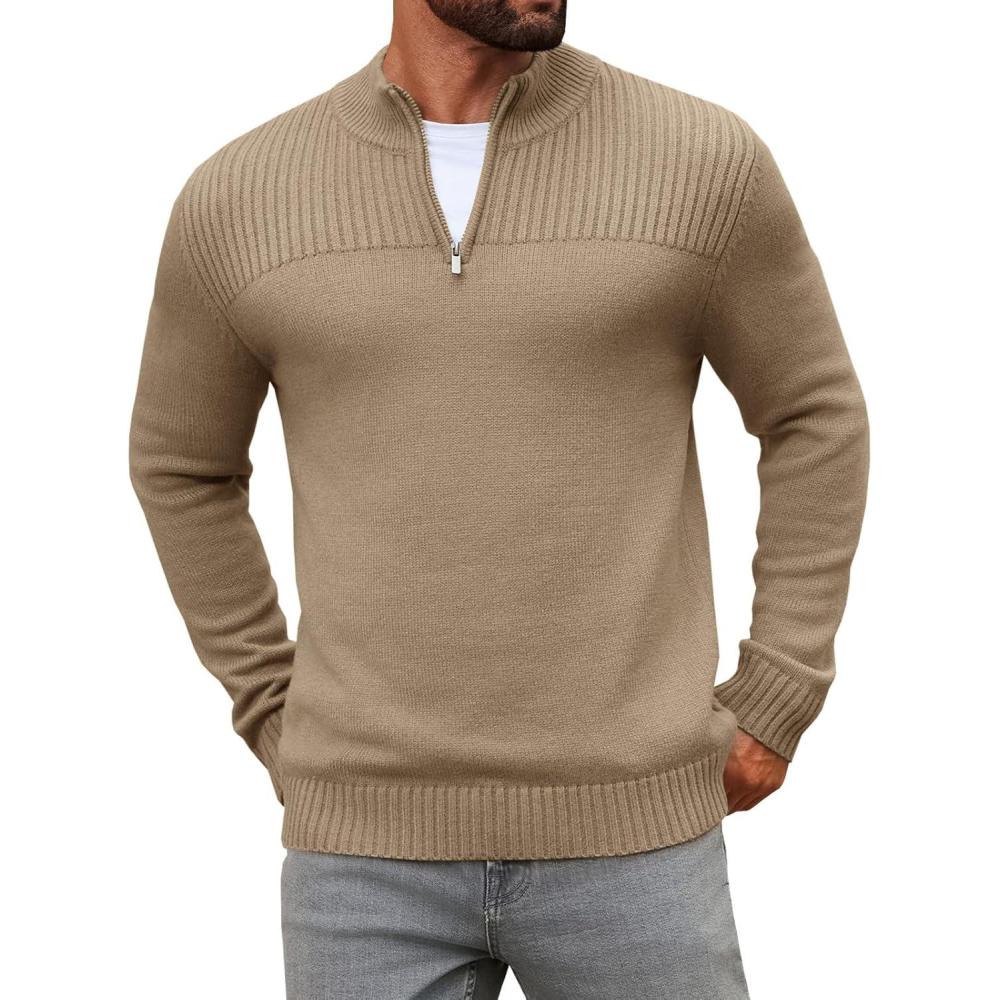 Runcati Mens Quarter Zip Sweater Long Sleeve Slim Fit Pullover Mock Neck Casual Ribbed Knit Polo Sweaters(Khaki)