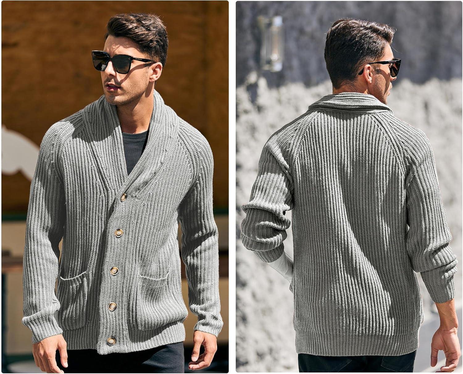 Runcati Mens Shawl Collar Cardigan Sweaters Button Down Open Front Knitwear Cable Knitted Ribbed Jackets Outwear(Gray)