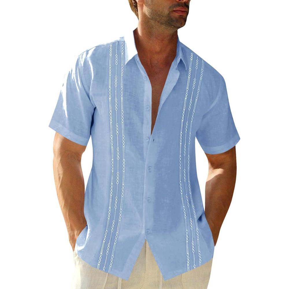 Runcati Mens Short Sleeve Guayabera Shirts Linen Cotton Button Down Mexican Embroidered Cuban Wedding Shirt Summer Beach Tops(03 Sky Blue)