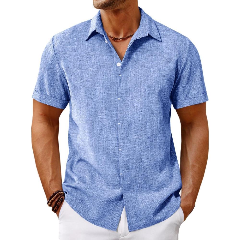 Runcati Mens Short Sleeve Linen Shirts Button Down Casual Texture Summer Beach Wedding Tops(Jean Blue)