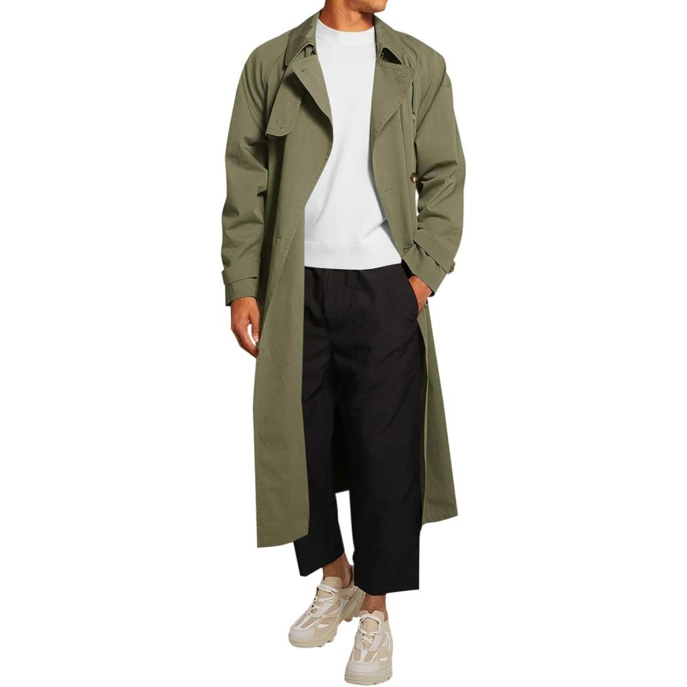 Runcati Mens Trench Coat Double Breasted Belted Windbreaker Jackets Lapel Lightweight Long Jacket Casual Overcoat(Army Green)