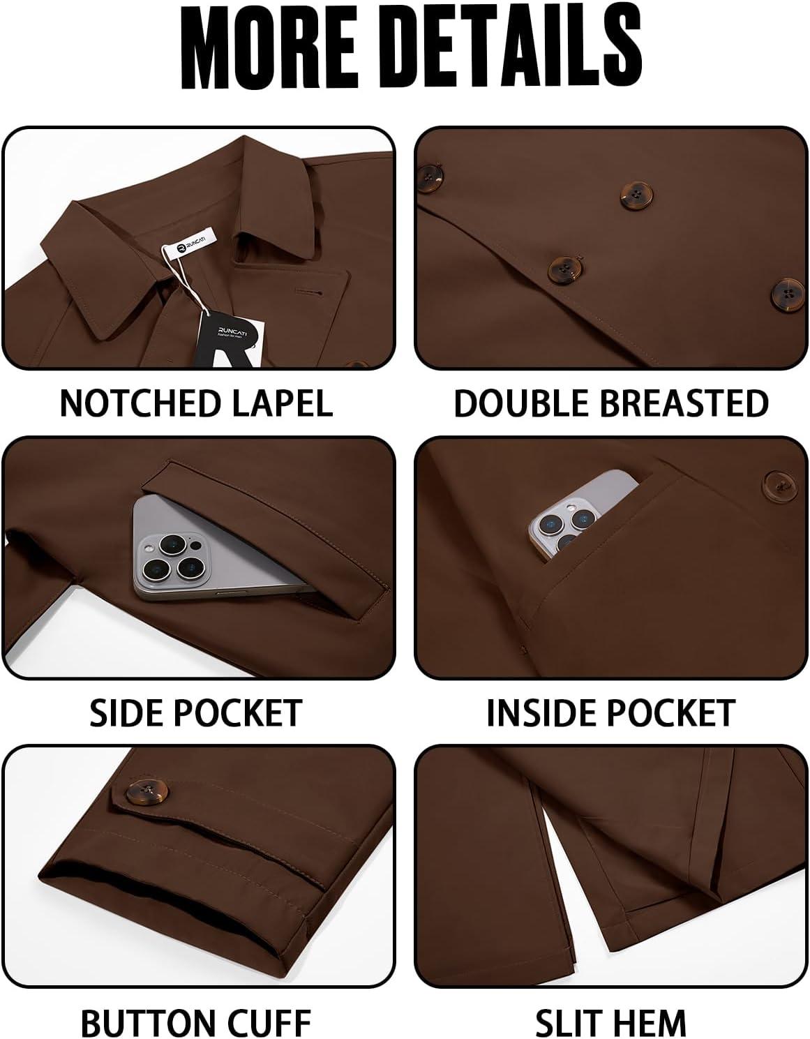Runcati Mens Trench Coat Double Breasted Notched Lapel Casual Belted Windbreaker Fall Classic Long Jacket Overcoat(Brown)