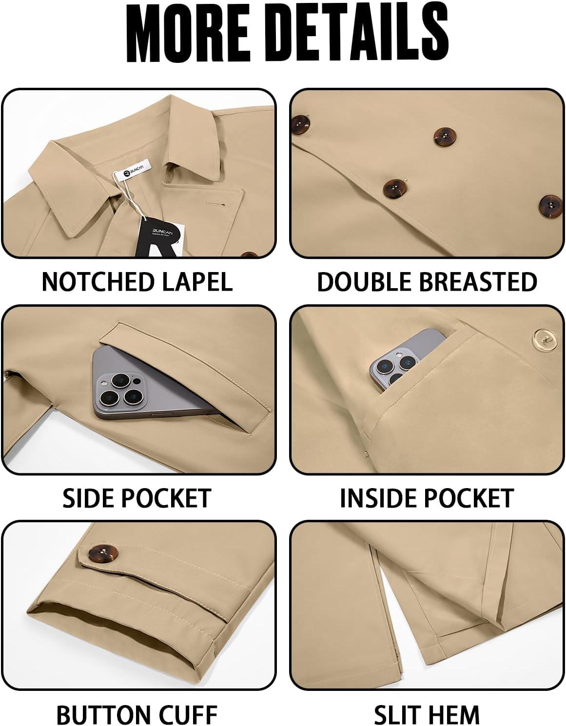 Runcati Mens Trench Coat Double Breasted Notched Lapel Casual Belted Windbreaker Fall Classic Long Jacket Overcoat(Khaki)