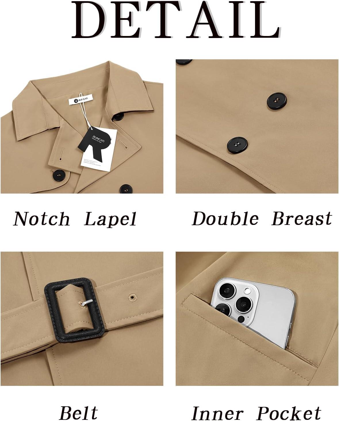 Runcati Mens Trench Coat Double Breasted Notched Lapel Jacket Casual Belted Windbreaker Overcoat(Khaki)